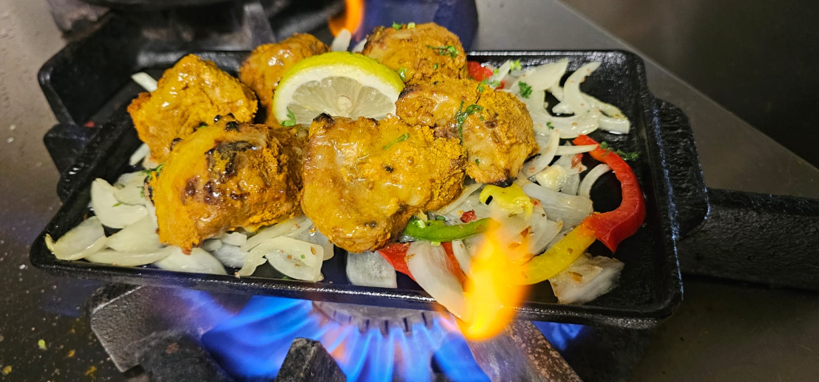 Gambas macérées dans un bouquet d’épices cuit dans le tandoor
