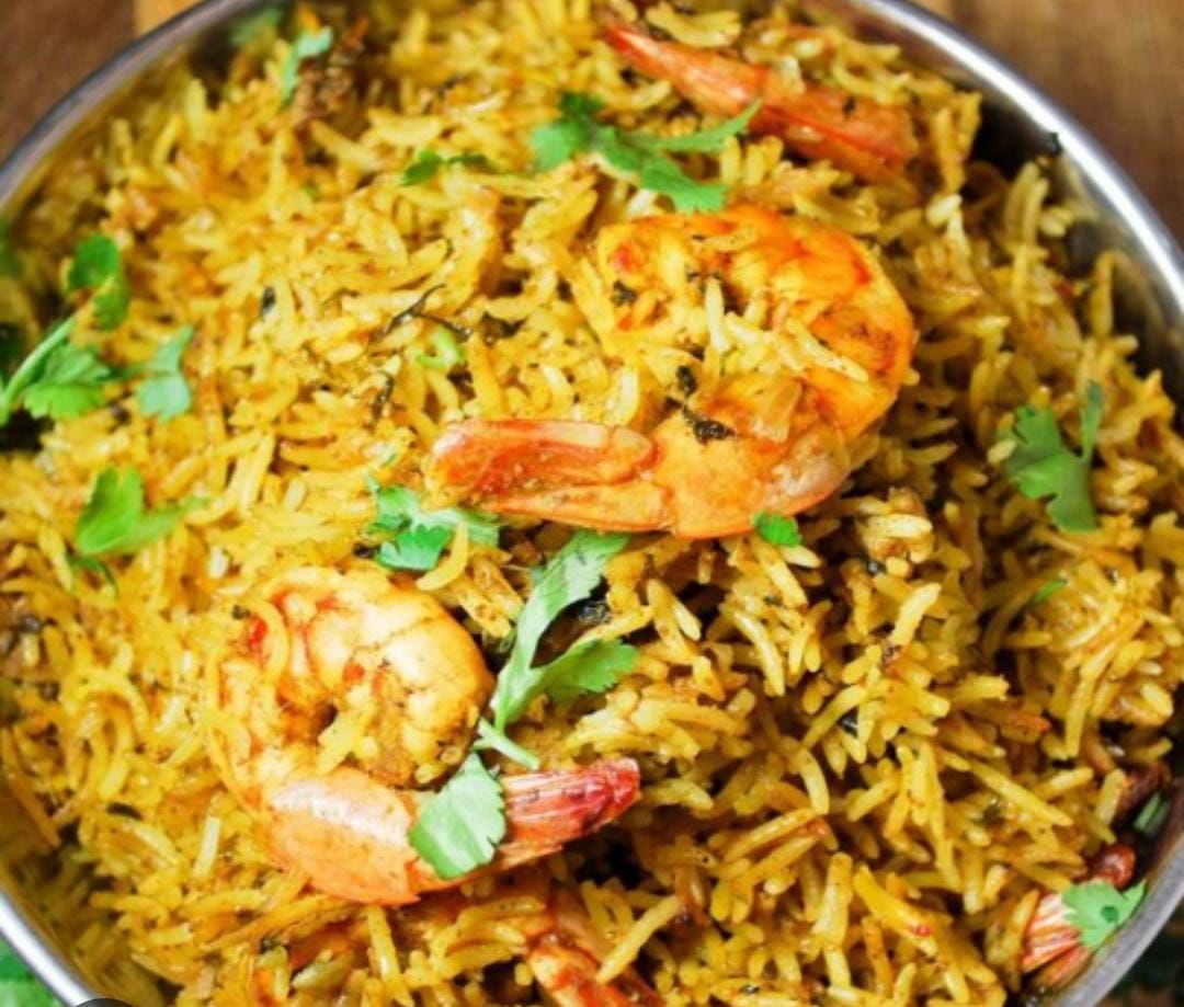 Riz mijoté avec un panaché de crevettes, cajou, tomates et aromates