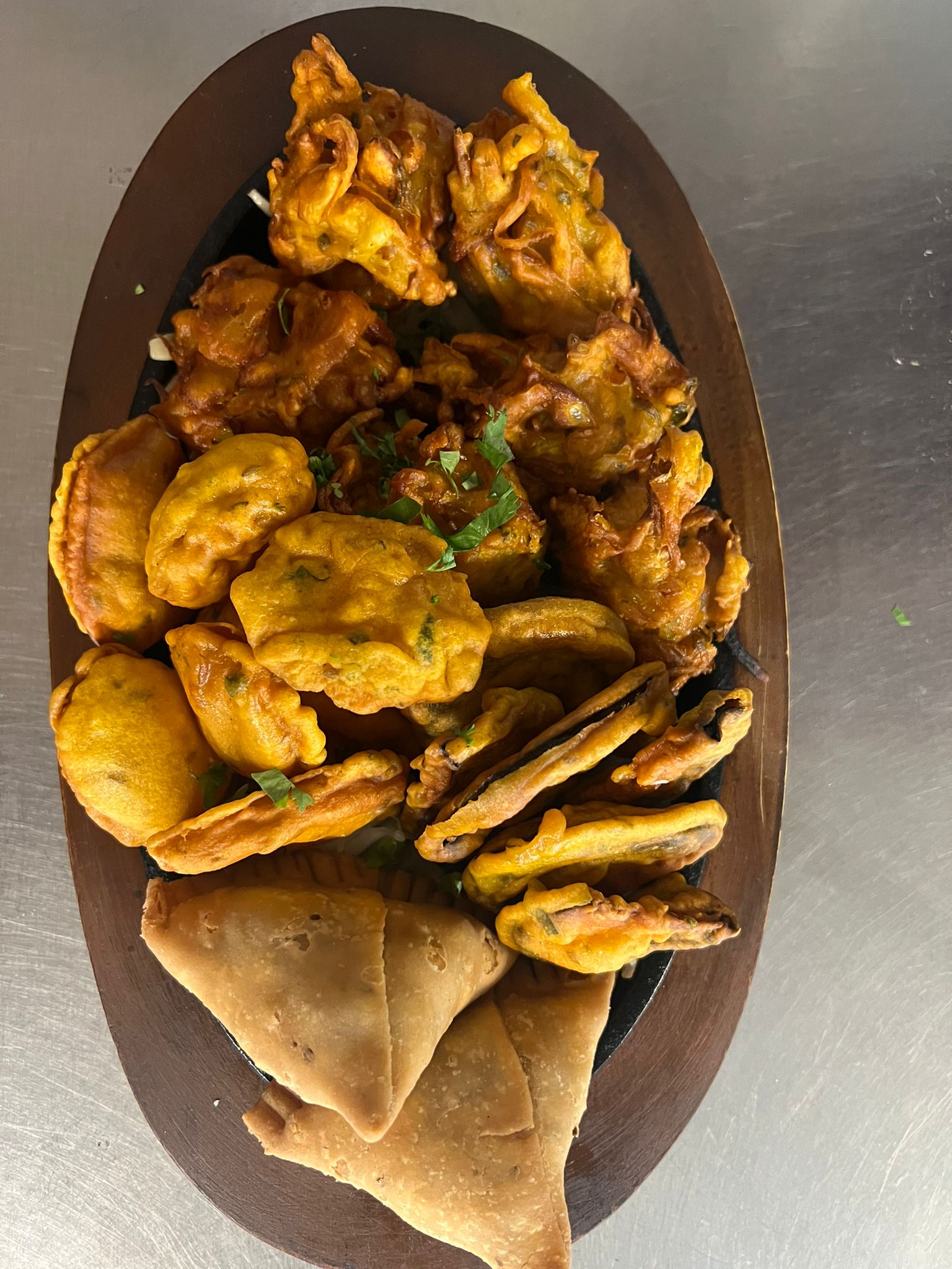 Beignets aubergine, pommes de terre, poulet et oignons